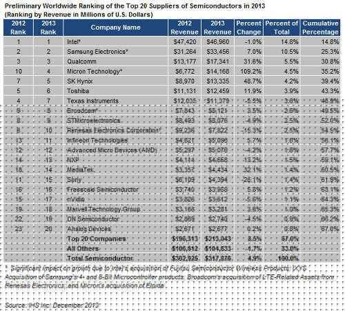 Partly because of its success in the booming DRAM and NAND markets, Micron will grow by 109.2 % in 2013, catapulting the company up the semiconductor market’s ranks to No. 4 in 2013, rising from No. 10 in 2012.